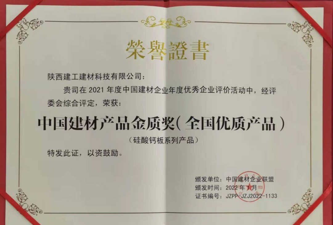 近日,陜建建材科技公司在2021年度中國建材企業(yè)年度優(yōu)秀企業(yè)評價活動中,硅酸鈣板系列產(chǎn)品榮獲中國建材產(chǎn)品金質獎(全國優(yōu)質產(chǎn)品),這是繼建材科技獲得“2021年度中國建材企業(yè)500強”和“2021年中國硅酸鈣/纖維水泥板企業(yè)10強”后的又一殊榮,是對公司在綠色新型裝飾裝修板材領域取得成績的充分肯定。